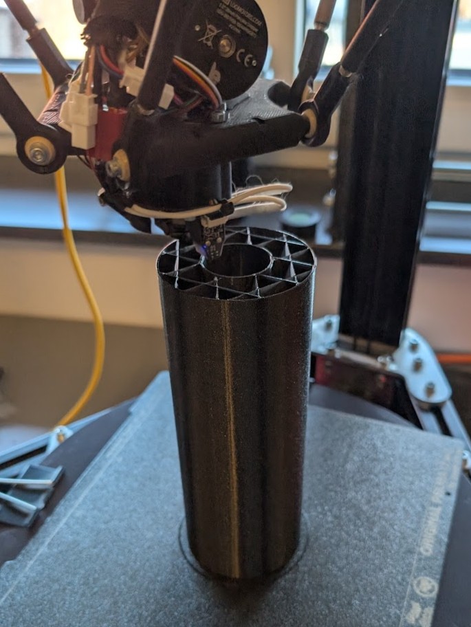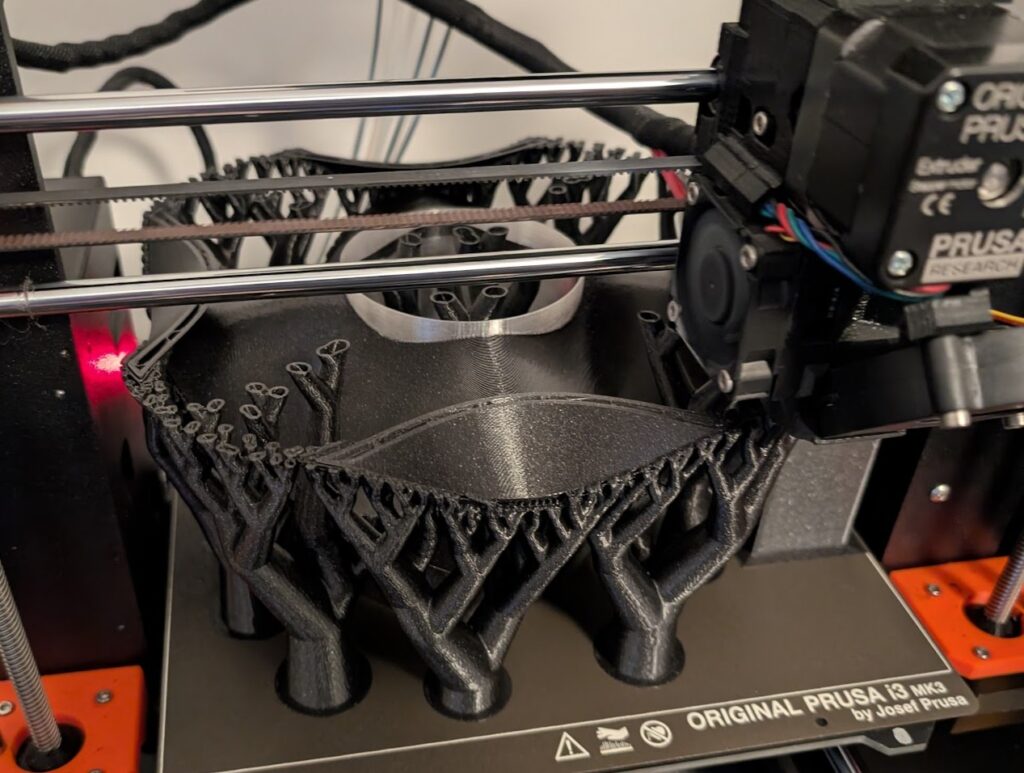 Für die Beleuchtung einer Einfahrt wurden individuelle Außenlampen konstruiert und gefertigt. Standardlösungen aus dem Baumarkt konnten den gestalterischen und funktionalen Anforderungen nicht gerecht werden. Ziel war eine Lösung, die funktional überzeugt und sich zugleich ruhig, hochwertig und stimmig in das Umfeld einfügt. Besonderes Augenmerk lag auf dem einfachen Austausch sowie der freien Wahl des Leuchtmittels. In diesem Fall kommen E27-Zigbee-Leuchtmittel zum Einsatz, wodurch sich auch animierte Lichtszenen realisieren lassen. Der Lampenkopf wurde in einem aufwendigen Multi-Material-3D-Druckverfahren gefertigt. Zum Einsatz kamen dabei das Hauptmaterial des Bauteils, ein separates Stützmaterial sowie ein transluzenter Bereich zum Schutz des Leuchtmittels. Die Fertigungszeit pro Lampenkopf beträgt rund fünf Tage.